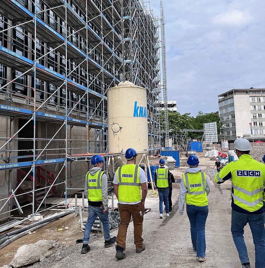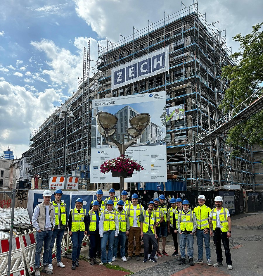 Am 6. Juni 2024 durften wir mit unseren Studierenden aus den Kursen Bauprozessmanagement und Building Information Modeling auf der ZECH-Baustelle Torhaus Süd in Duisburg spannende Einblicke u.a. im Rahmen eines Live-Workshops zur Taktsteuerung oder in der Anwendung digitaler Werkzeuge zum Mängelmanagement in das Berufsbild der Bauleitung sammeln.