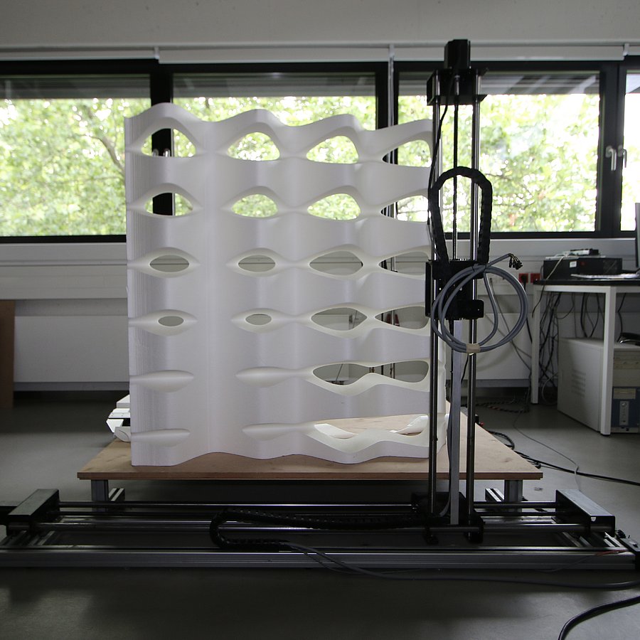The Styrocutter can cut out volumes from polystyrene blocks with a hot wire and thus enables experimental shape processing in two axes.